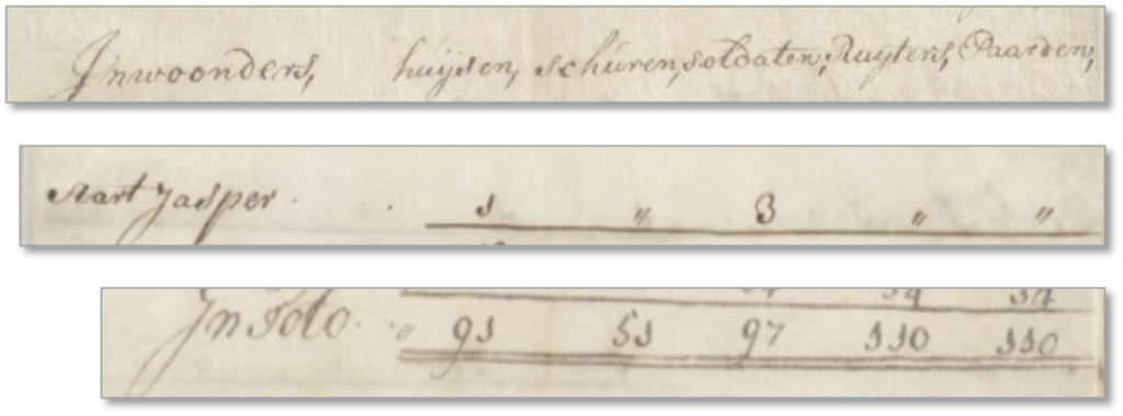 Volgens onderstaand overzicht heeft Aart Jasper(s) één huijs waarin hij drie soldaten kan huisvesten. In totaal waren er in Beugen toen 93 huijsen en 51 schuren waarin ze 97 soldaten, 110 ruijters en evenzoveel paarden konden herbergen.