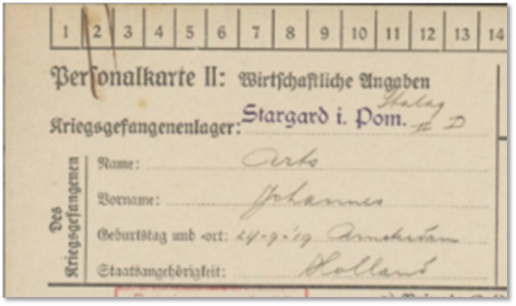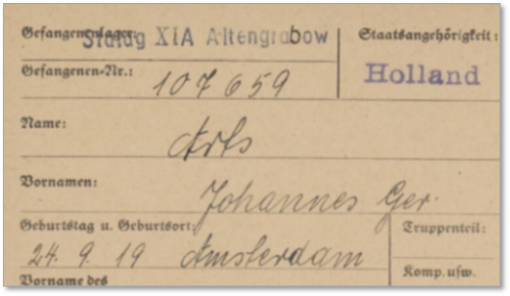 Johannes Arts (1919-1983) uit Amsterdam dient in het 3e grensbataljon. Hij wordt in mei 1940 krijgsgevangen genomen en zit een maand vast in kamp Stargard bij Szczecin (Polen). In 1943 wordt Johannes opnieuw gevangen genomen. Hij wordt naar het Stalag (=Stammlager/Krijgsgevangenkamp) Altengrabow (bij Maagdenburg) gestuurd. Na de oorlog komt hij op 23 mei 1945 aan in Weert in het Ontvangstcentrum Gerepatrieerde Krijgsgevangenen.