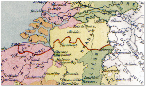 Scheidslijn na 1648 tussen de Noordelijke en Zuidelijke Nederlanden.