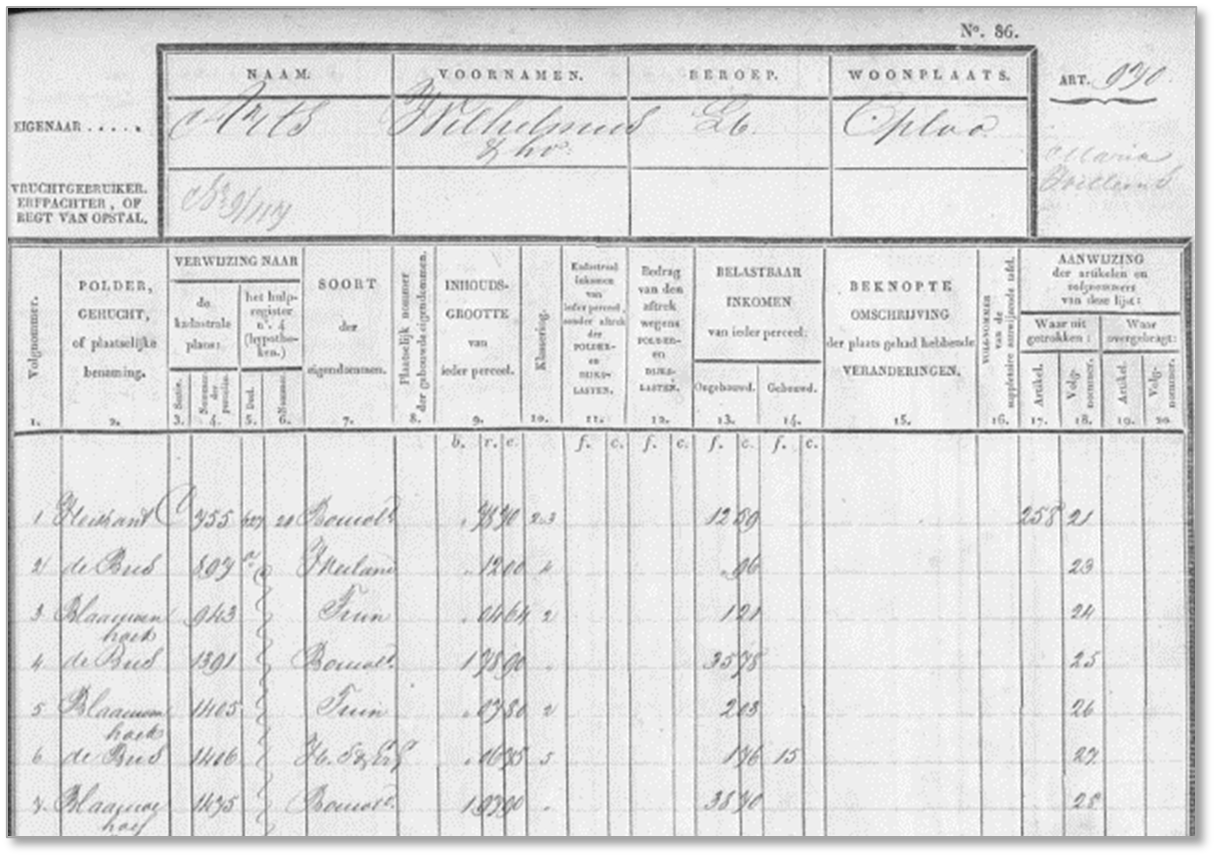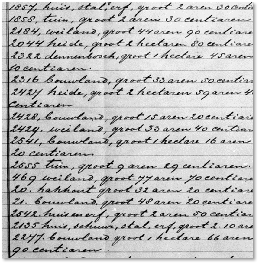 In 1832 werd in Nederland het kadaster ingevoerd. Op deze kadasterkaarten werden alle percelen en gebouwen ingetekend. De onroerende eigendommen waren vastgelegd per persoon in een zogeheten leggerartikel. Ieder huis, schuur, weiland, bouwland, bos etc. staat hier apart op vermeld met een eigen nummer. De perceelnummers verwezen dan weer naar percelen op de kadasterkaarten.
