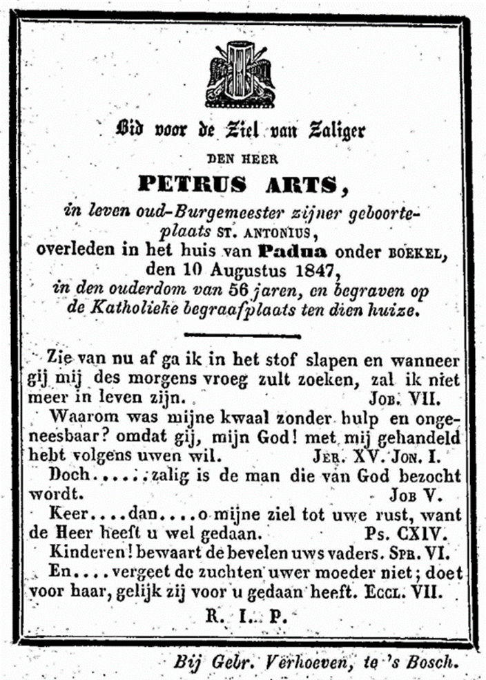 Hendriks oudste zoon Peter Arts (1791-1847) neemt de rol van burgemeester over van zijn vader in 1830. Peter trouwt in 1831 met Petronella Jeurgens en ze krijgen vijf kinderen. Hun drie dochters overlijden op jonge leeftijd (6, 9 en 21 jaar). Peter treedt op eigen verzoek af als burgemeester in 1847 en hij overlijdt drie dagen later in het huis van Padua.
