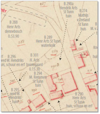De boerderij en schuur zelf liggen deels in Sambeek en deels in Sint Anthonis. In 1833 wordt het geheel kadastraal toegewezen aan de laatste gemeente. Na hun overlijden gaat het ‘huis, schuur en erf groot negen aren twintig centiaren’ via hun jongste dochter Hendrika Arts (1837-1871) naar schoonzoon Gerardus Sweere.